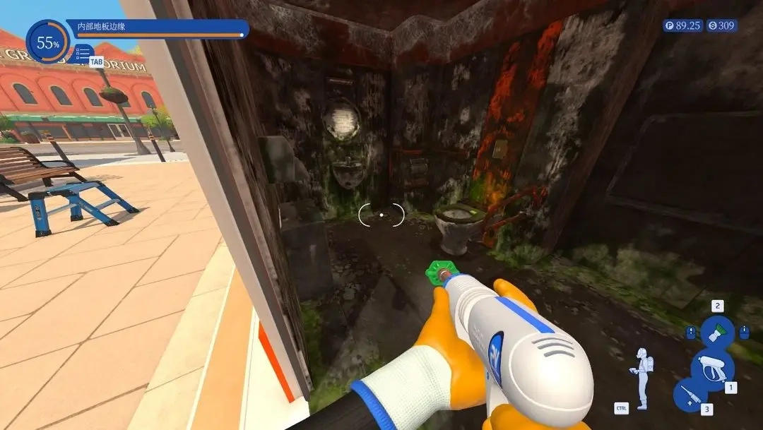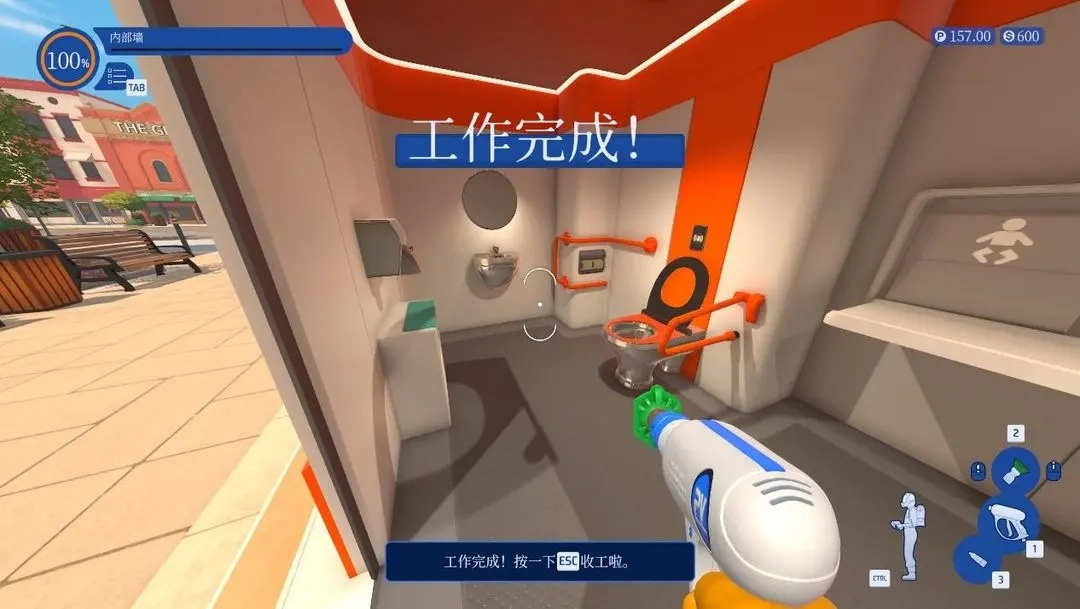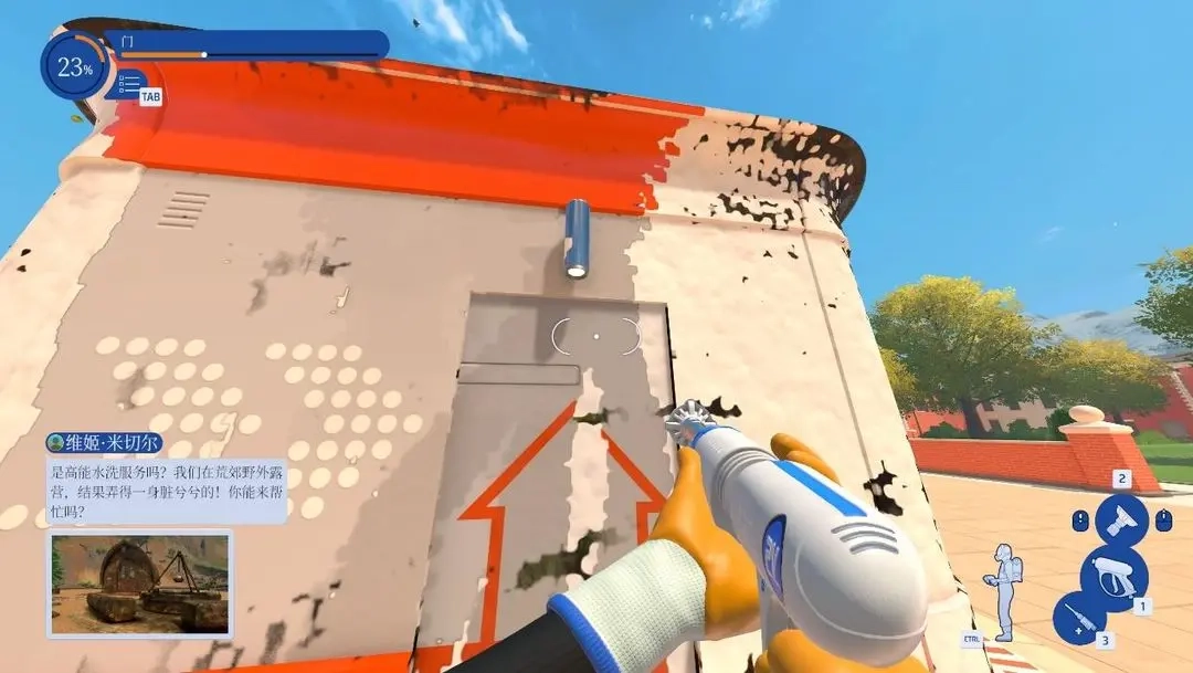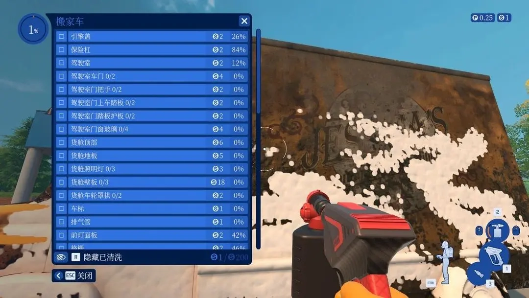 按下Q键能够让残留的污渍高亮显示,这样就能有效防止遗漏。游戏把清洁区域分成了多个模块,每个模块都有单独的进度条,判定标准很宽松,一般不用把所有污渍都彻底清理干净就能达到100%的完成度,剩下的污渍会自己消失。