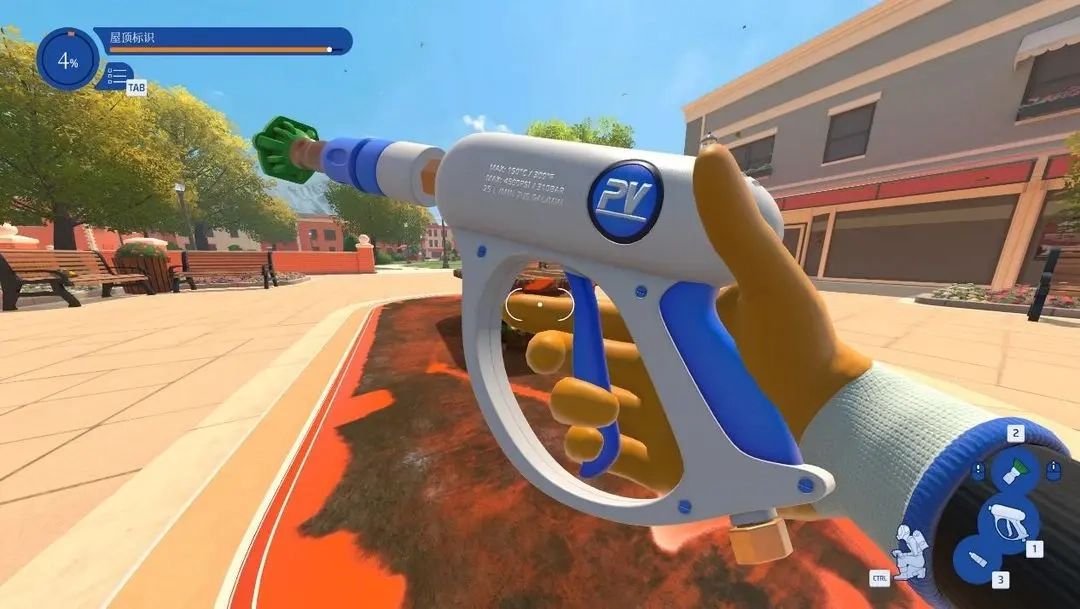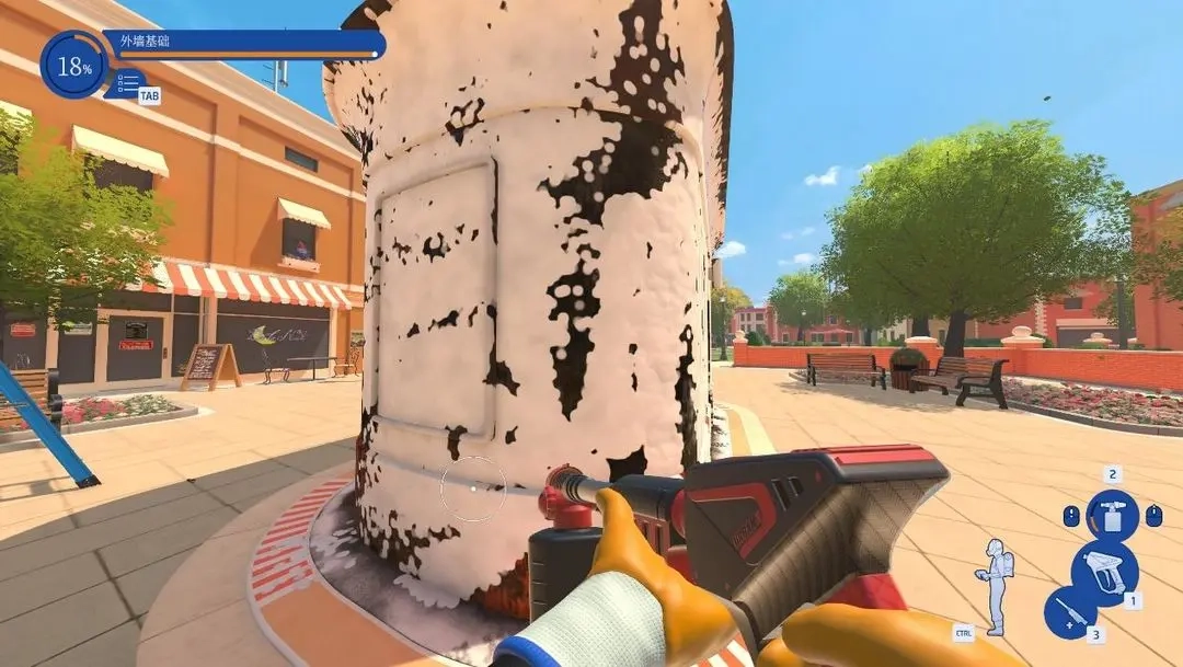 游戏前期会提供白色和黑色两款基础水枪,它们各自侧重于范围和威力,还配备了多种能够切换的喷头。玩家能够解锁圆盘花洒这类特殊水枪,以此来应对大面积的墙面。
