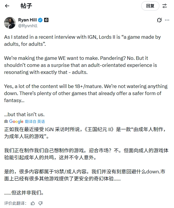 就像我在近期接受IGN采访时提到的,《堕落之主2》是“一款由成年人打造、面向成年玩家的游戏”。