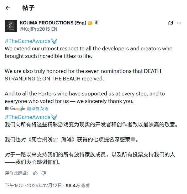值得一提的是,即便最终未能斩获任何奖项,TGA颁奖典礼落幕之后,小岛工作室依旧发布了致谢声明,并且为《死亡搁浅2》所获得的七项提名深感荣幸。