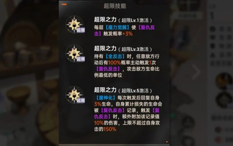 完成超限进阶后,梅利奥达斯的反击机制得到了进一步的强化。触发反击的概率有所提升,同时解锁了新能力:当处于全反击状态时,能够主动对已经完成行动的敌人发起一次反击。另外,在魔神化状态下还可以获得生命回复效果,这极大地增强了他的持续作战能力。从整体上看,梅利奥达斯在龙族卡塞尔之门中是一名集坦度、反制与输出潜力于一身的角色,尤其适合应对那些高频释放技能的敌方阵容。