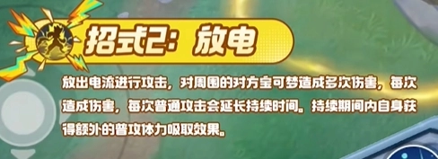 放电:以自身为中心造成范围持续伤害,普通攻击命中会延长持续时间并附加体力回复效果。