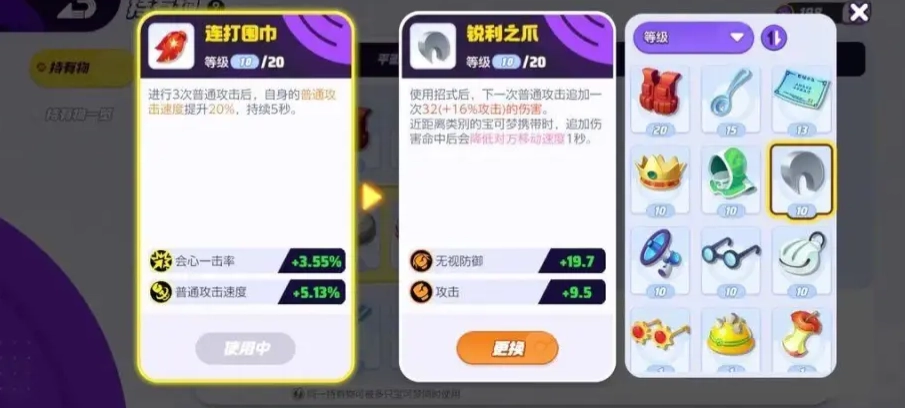 锐利之爪:替代连打围巾,每次使用招式时都会触发锐利之爪的效果,普通攻击后则会触发力量头带带来的普攻额外伤害效果。