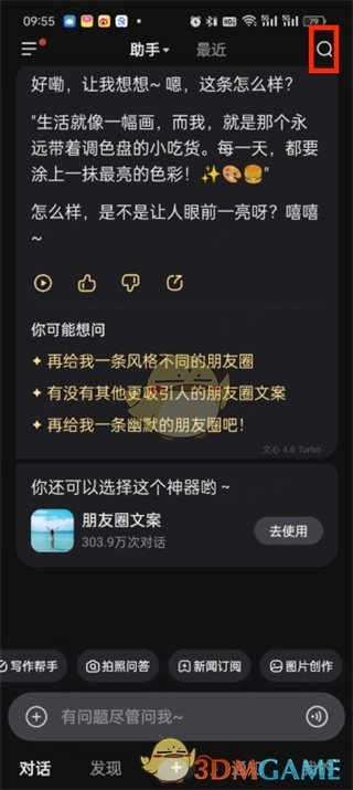 1. 第一步,打开文心一言软件。进入首页后,要点击右上角的【搜索图标】。