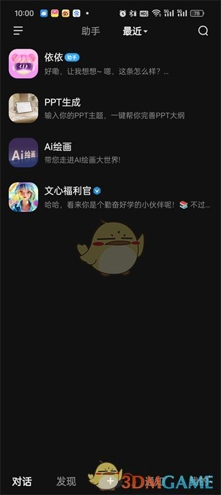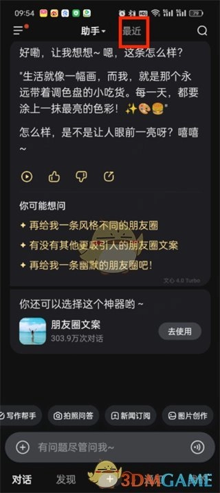 1. 第一步,打开文心一言app,进入首页后,能够切换至不同页面,此时点击【最近】。