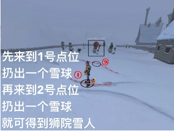 2、前往1号点位,扔出一个雪球,接着前往2号点位,再扔出一个雪球,就能获得狮院雪人。各点位位置见图示。