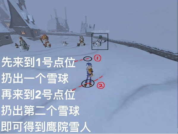 5、前往1号点位,抛出一个雪球,接着移步至2号点位,扔出第二个雪球,如此便能获得鹰院雪人。