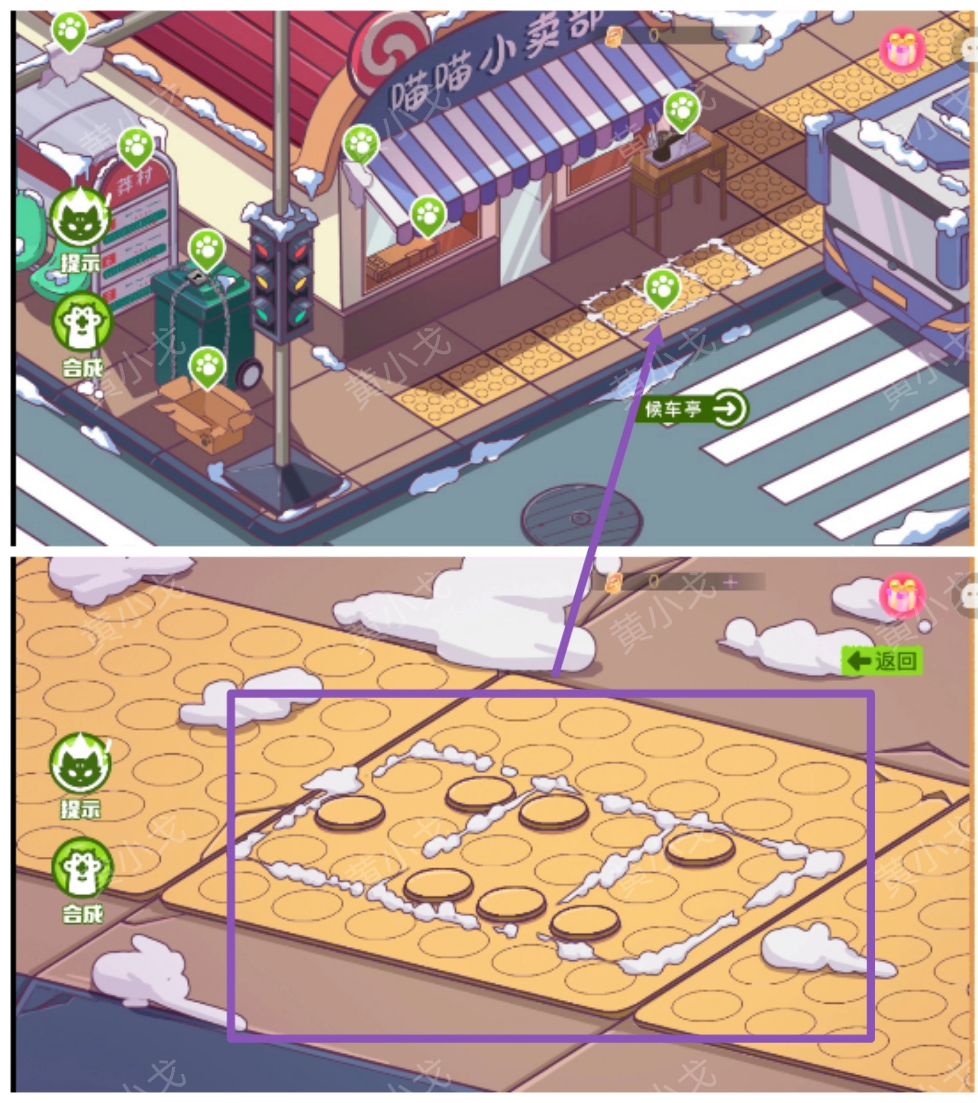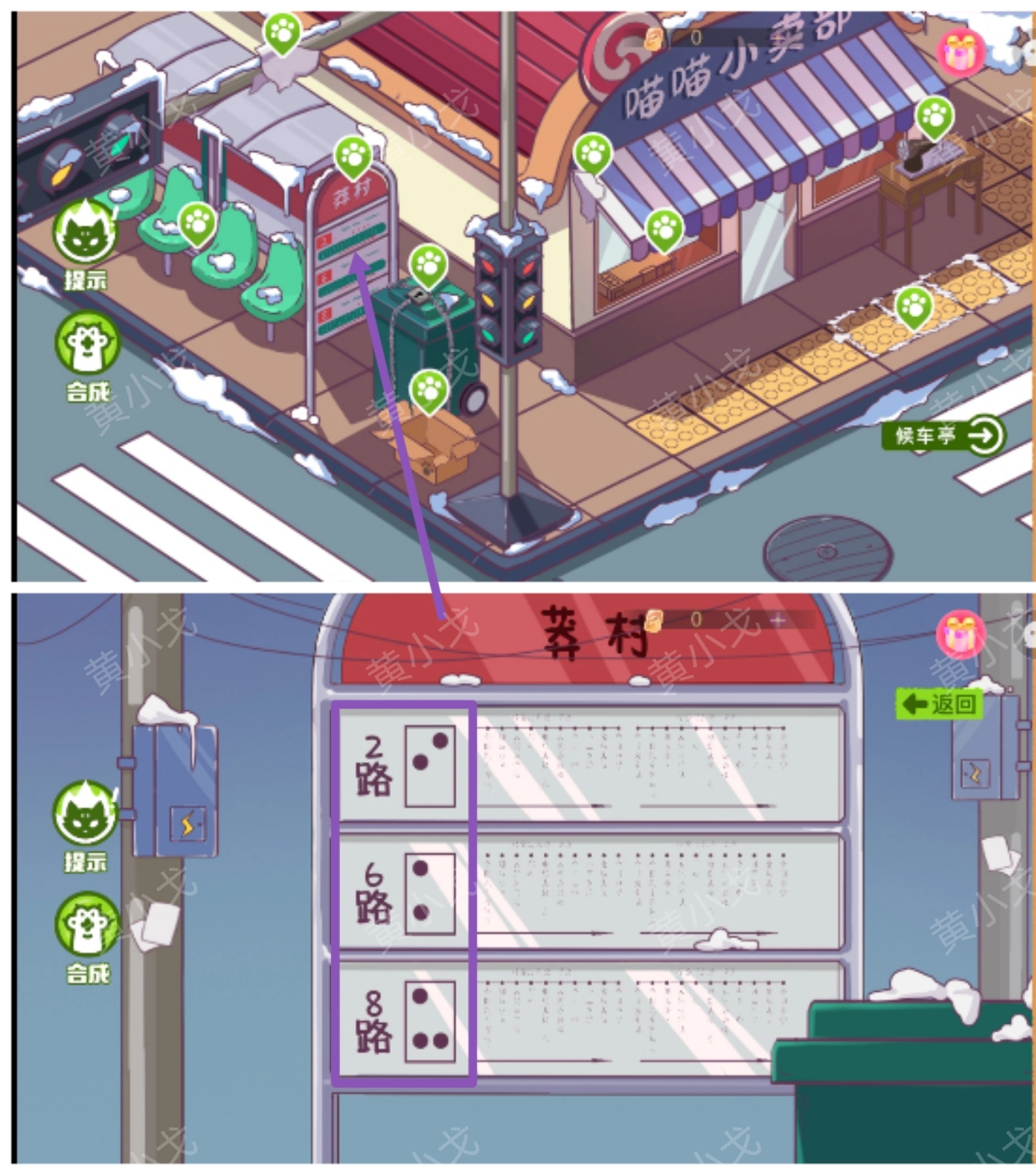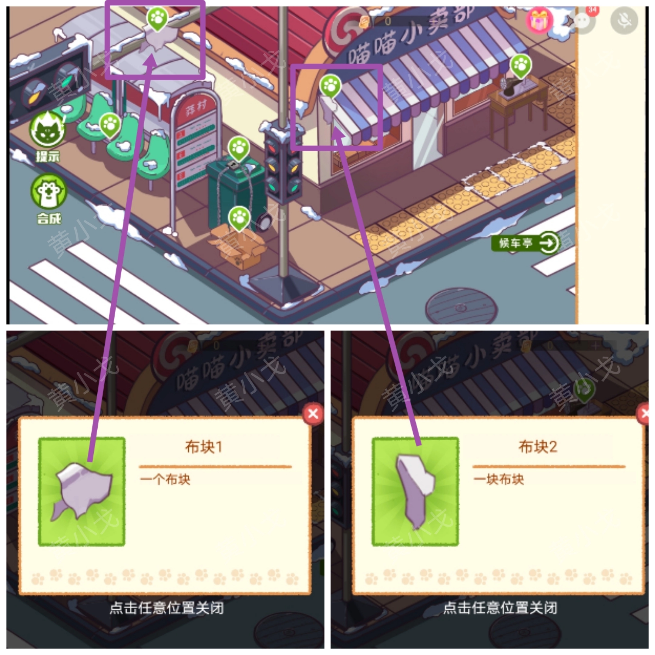 1.(公交站)点击获取商店屋檐上的【布块2】;红绿灯架上的【布块1】