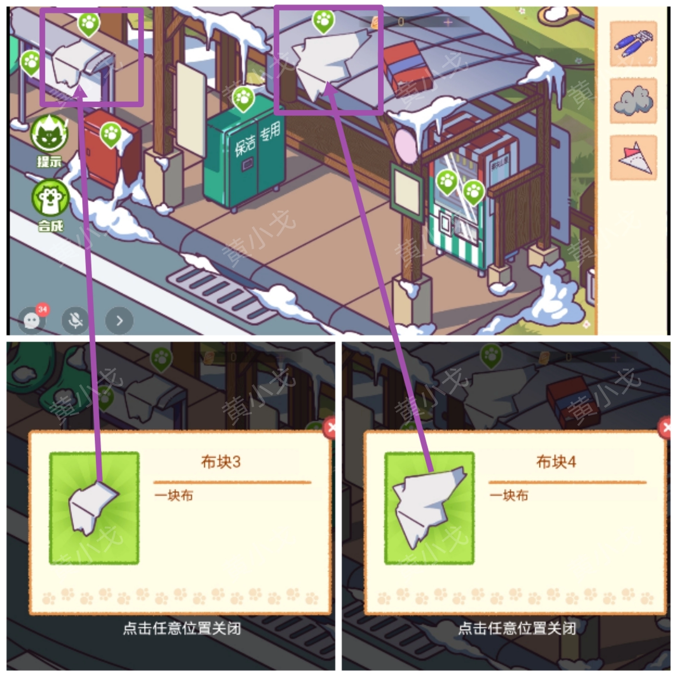 3.点击获取公告栏上的【布块3】;亭子上的【布块4】