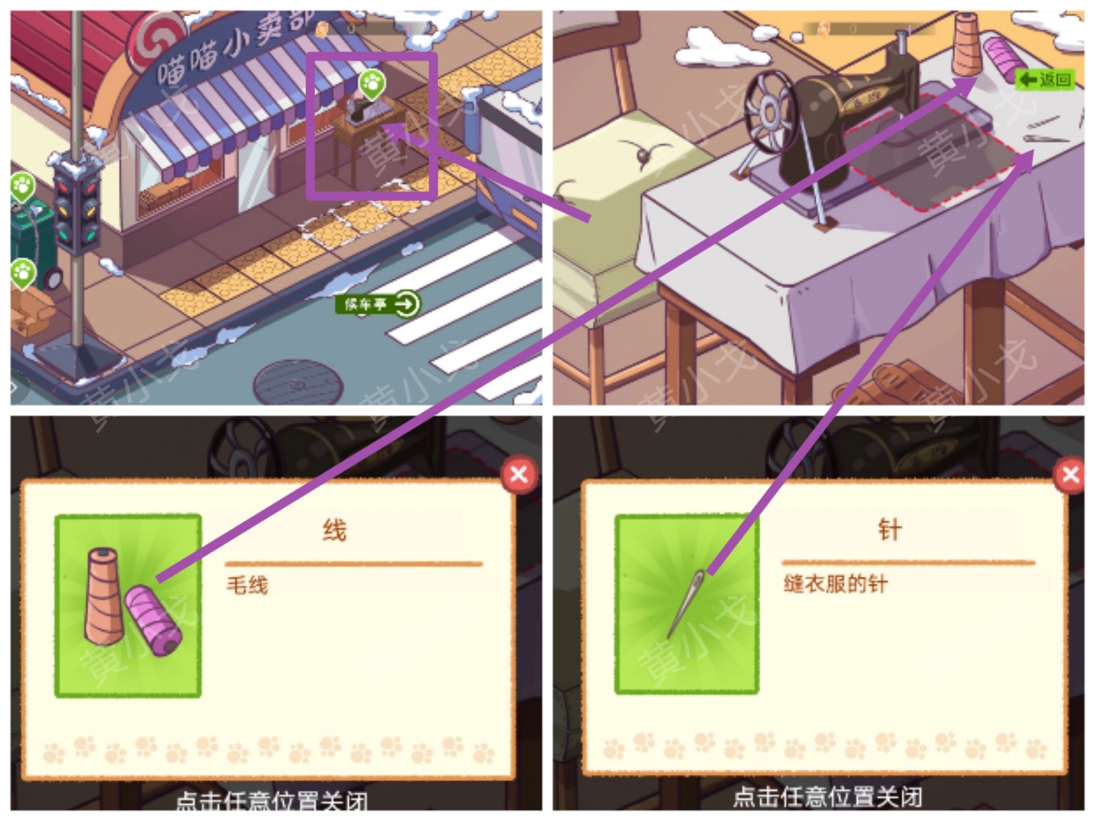 4.(公交站)点击小卖部门口的缝纫机,获得【针】和【线】