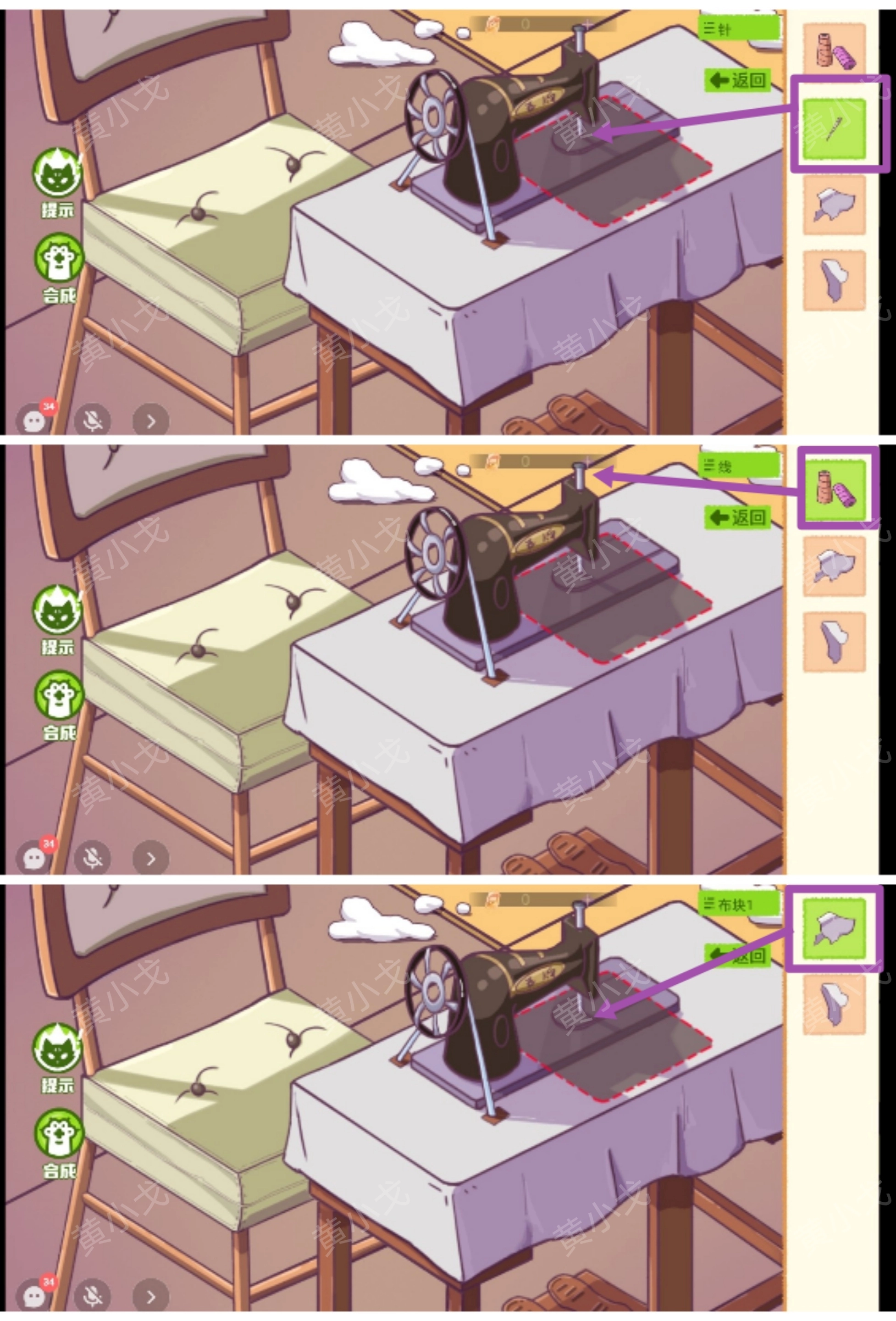 5. 将【针】与【线】放置到缝纫机上;接着把【布块1】、【布块2】、【布块3】以及【布块4】也放上去。