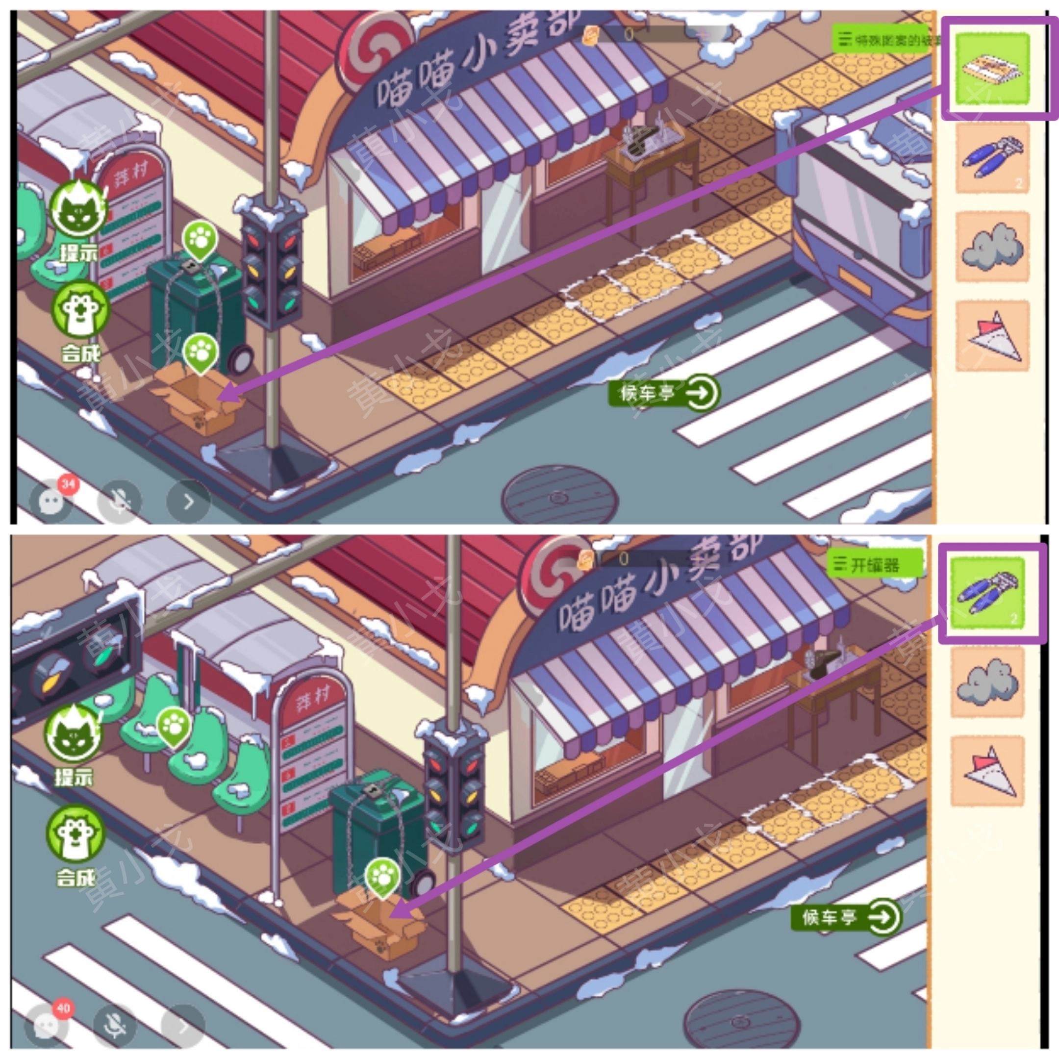 2.(候车亭)点击亭子上的盒子,打开,获得【剪纸】、【棉花1】和两个【开罐器】