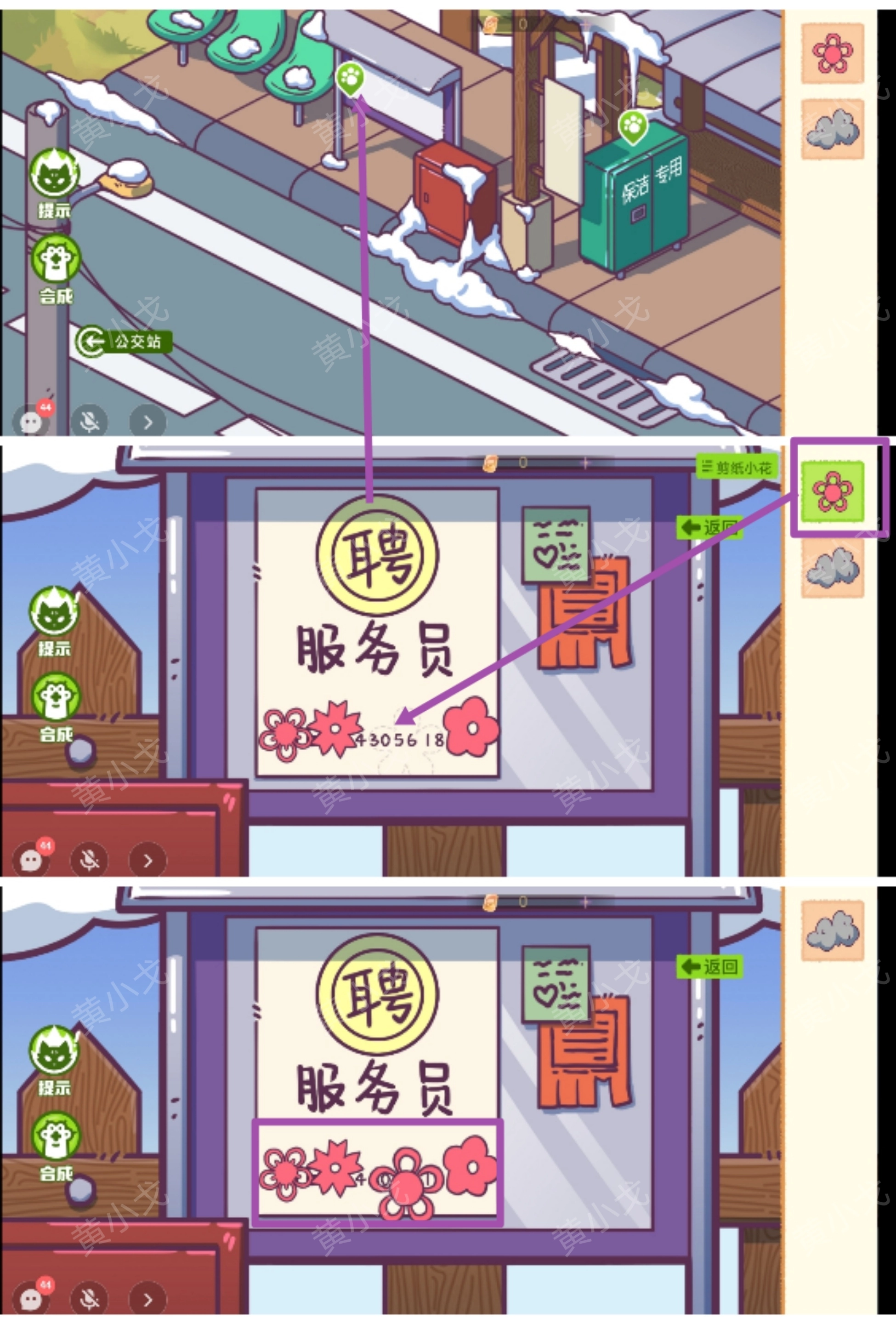 9.(保安亭)点击公告栏,放上【剪纸小花】,获得线索(401)(告诉多多)