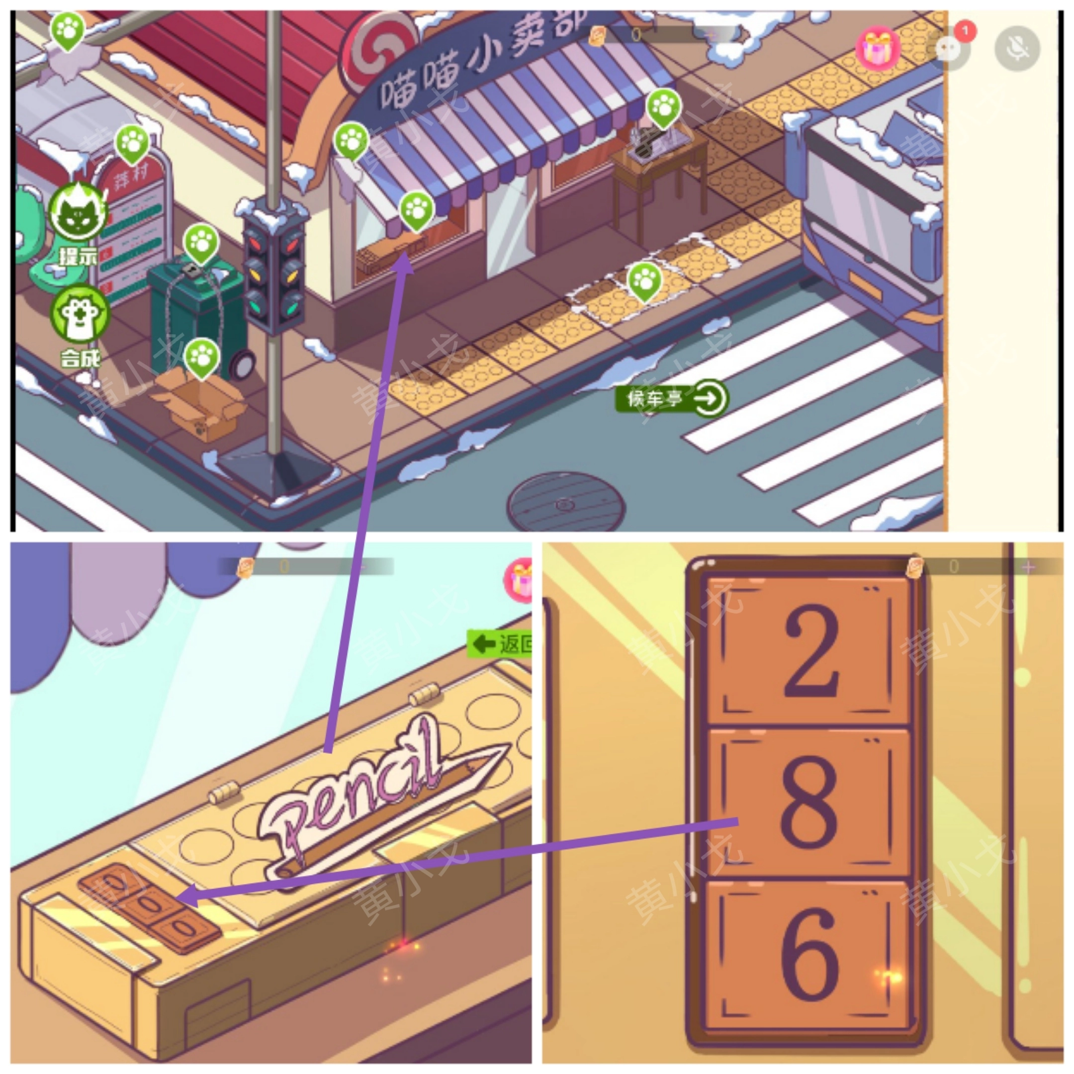 3. 轻点窗台上的木盒子,依据黄色盲道线上的图案以及公交站上的图案,输入密码“286” 。