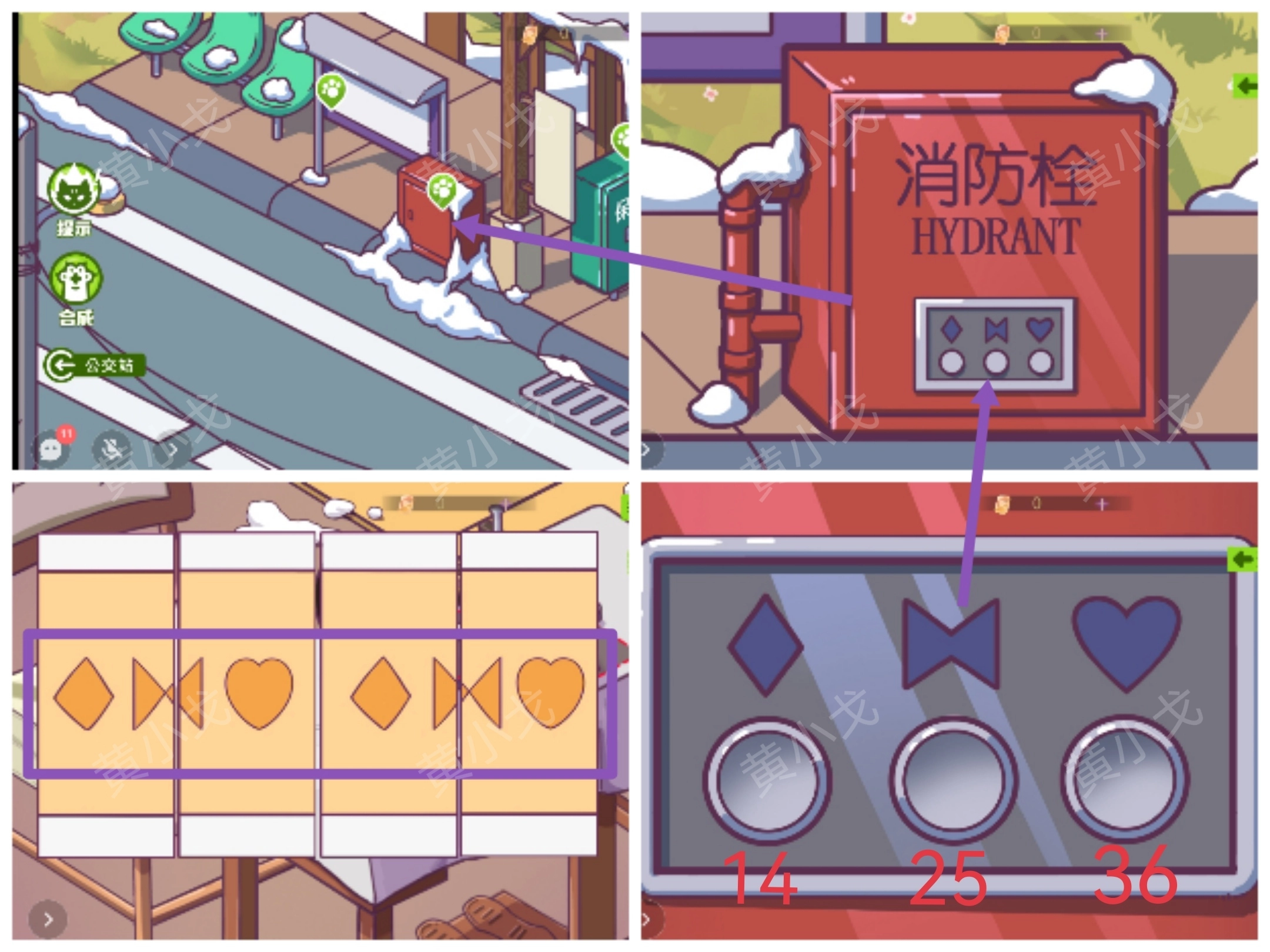 5.(候车亭)操作消防栓,依据【特殊图案的被套】上图案的排列顺序,按照(菱形◇、两个三角形、心、菱形◇、两个三角形、心)这样的顺序去点击相应按钮(可以让团子传递过来相关信息,或者由团子直接告知也没问题)