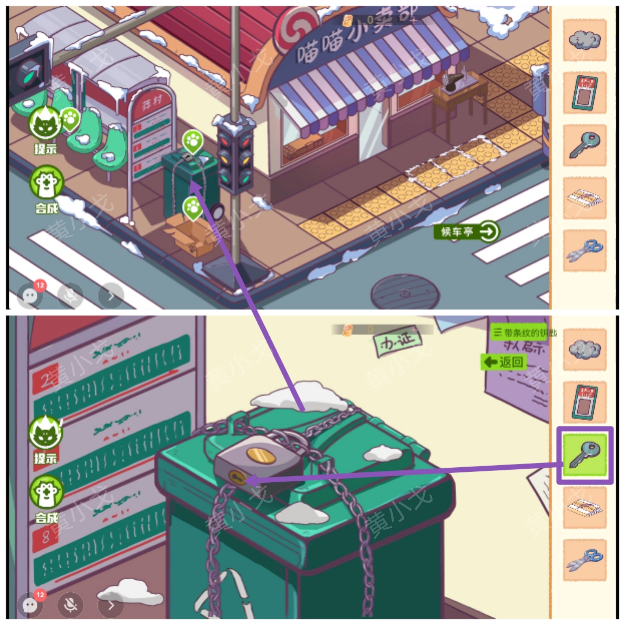 7.(公交站)点击垃圾桶,用【带条纹的钥匙】打开上面的锁