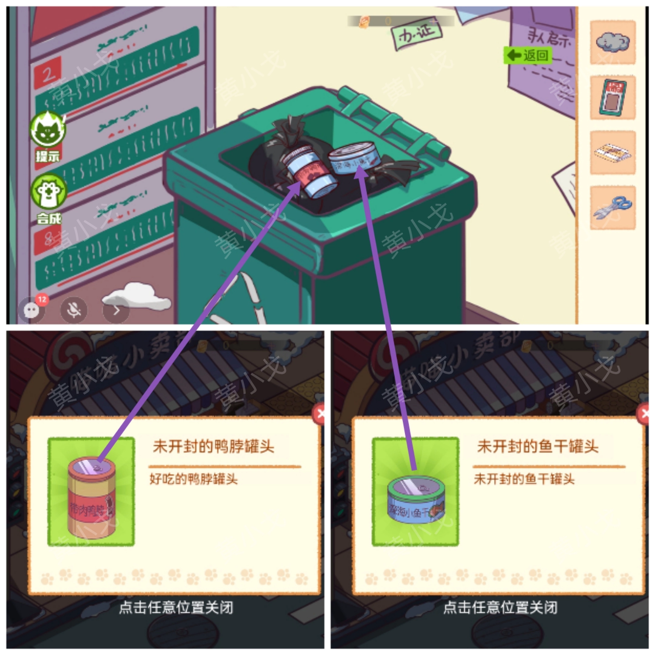 8.打开垃圾桶,获得【未开封的鸭脖罐头】和【未开封的鱼干罐头】