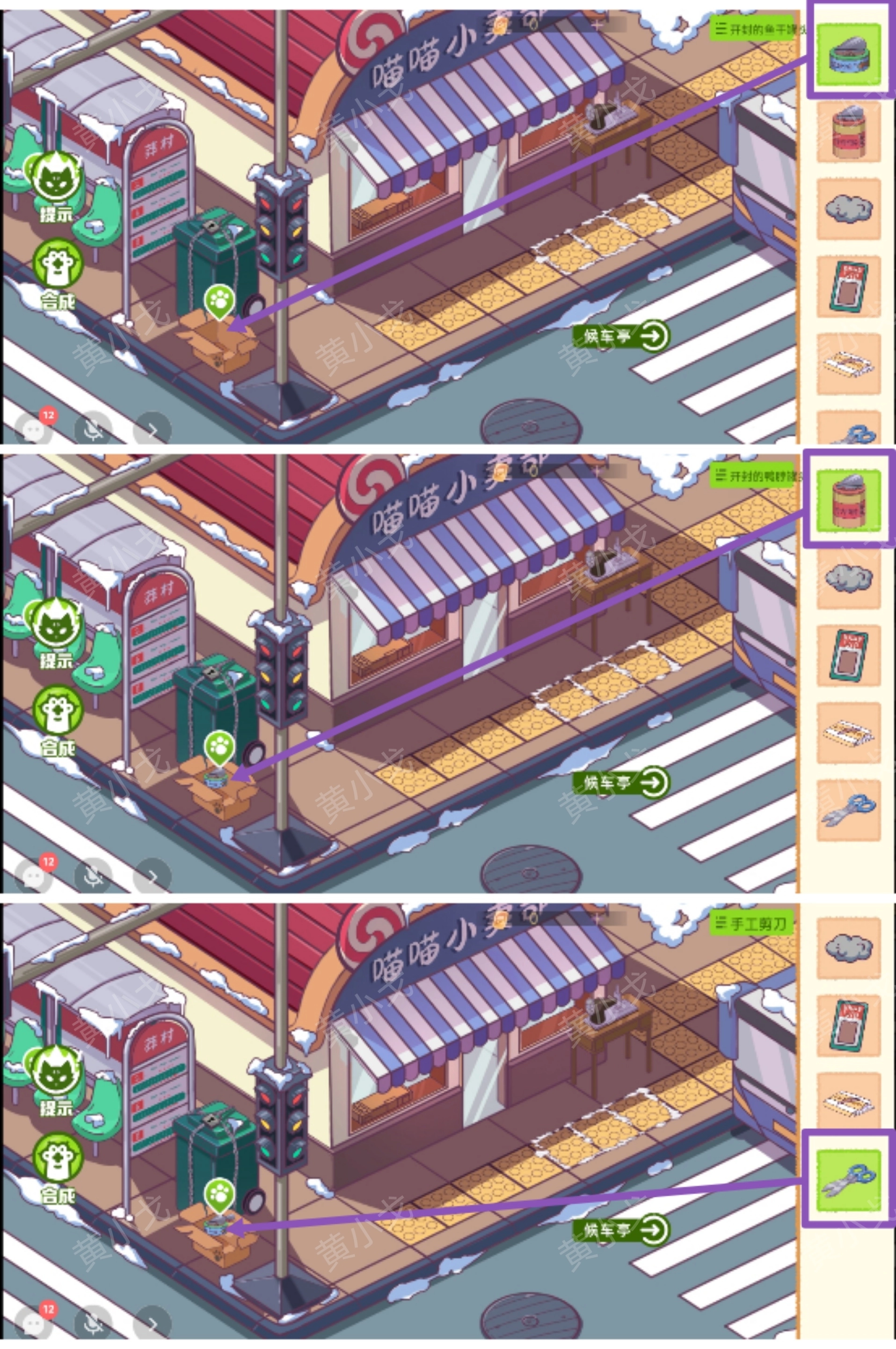 11.把【开封的鸭脖罐头】、【开封的鱼干罐头】和【手工剪刀】放到纸盒里传给团子