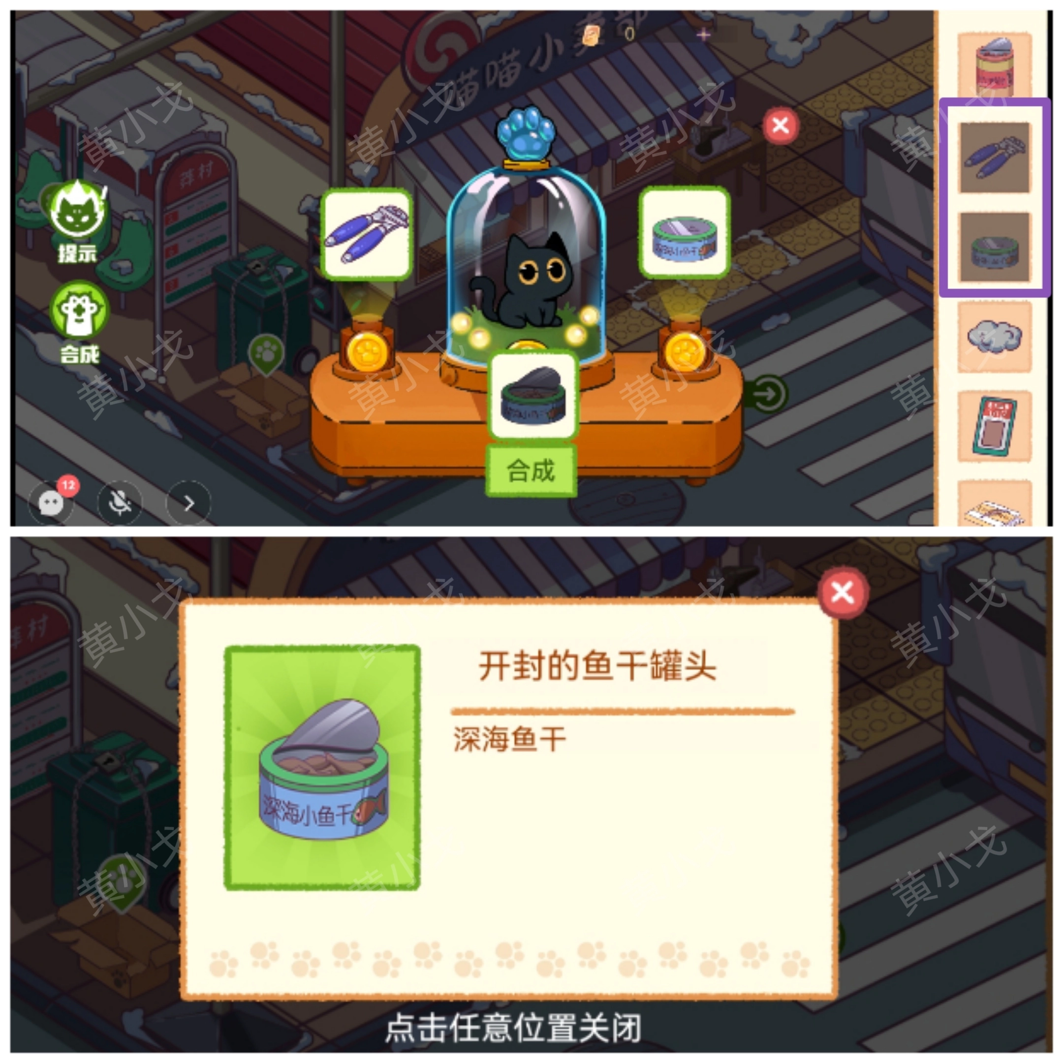 10. 将【未开封的鱼干罐头】与【开罐器】进行合成,从而得到【开封的鱼干罐头】(注意,【开罐器】需由团子传递过来)