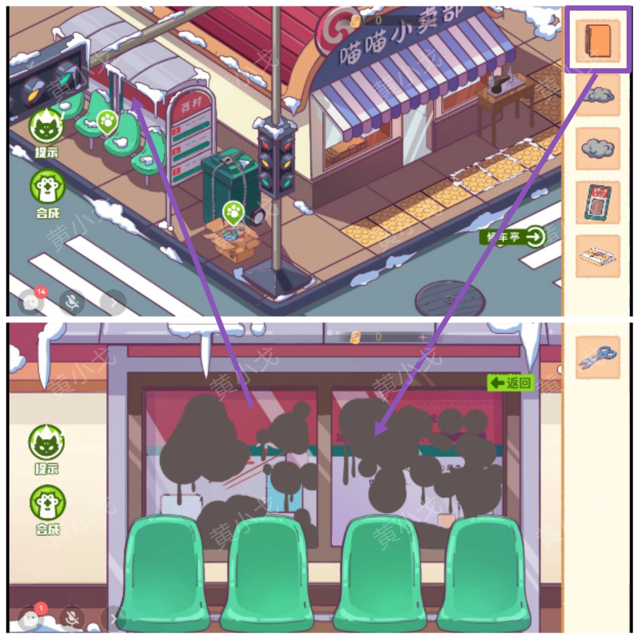 14.(公交站)点击公交亭,用【干净的毛巾】擦掉污渍