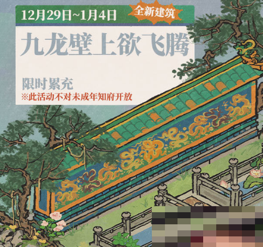 【九龙壁上欲飞腾】限时累充活动现已开启,活动期间累计充值指定数量的补天石,就能解锁全新4*2建筑【龙腾壁】。