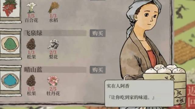 3、进入大娘的店铺后就能看到晴山蓝,收集5个松果和5个牡丹即可兑换该物品。