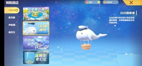 传奇阁目前上架着四款商品,分别是河童兽水潭、白白鲸喷泉、斑点鲨留声机与魔鳉鱼奇幻缸。这四款均为可交互的家具,要是能全部集齐,感觉足以打造出一个小型水族馆呢!