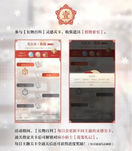 活动期间,【长物百科】每日将更新不同主题的灵感关卡,完成指定关卡的挑战后,即可解锁对应的小贴士【花笺札记】。