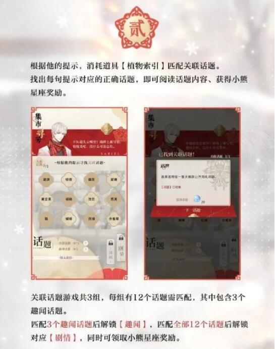 完成3组关联话题游戏后,就能按顺序解锁「集市寻芳」「窗纸贴花」「明灯映蕊」这三个活动的剧情了。