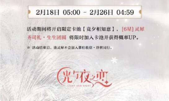 活动说明:活动期间将开启限定卡池【竟夕相知意】,[6星]灵犀 齐司礼・生生团圆 将限时加入卡池并获得概率UP。