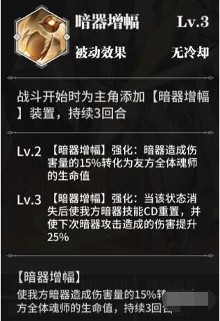 【暗器增幅】状态下暗器造成的伤害的15%转化为我方全体魂师的生命值持续3回合