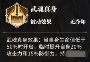效果:当自身生命值低于50%时开启,临时提升自身20%攻击力和15%防御力,持续4个回合