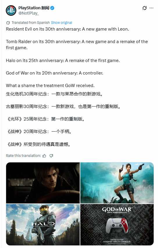 博主@NotiPlay_对《战神》《光环》《古墓丽影》《生化危机》这四款游戏的周年纪念情况进行了对比,发现相较于其他作品推出重磅重制版本或最新续作的做法,《战神》在周年纪念时只发布了一款主题手柄。