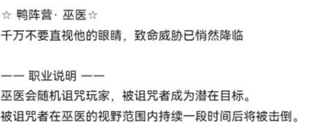 巫医的技能设计跳出了传统的直接攻击逻辑,转而采用“凝视诅咒”机制:游戏开始后,他会随机选定一名玩家并悄悄植入诅咒标记,被标记者对此毫不知情。一旦巫医能将目标持续锁定在自己的视野中达五秒,诅咒便会立刻触发,目标会悄无声息地倒地,整个过程既不会触发警报,也没有明显的动画效果,其他好人只能通过该玩家突然在语音频道中缺席来推测其可能失踪。更让局势棘手的是,巫医每成功完成一次咒杀,技能冷却就会自动重置,他可以随即重新挑选下一个猎物,从理论上来说,他能够实现“零痕迹的连续斩杀”。官方特别提醒玩家:千万不要直视他的眼睛——此刻正盯着屏幕的你,说不定就是下一个被标记的目标。