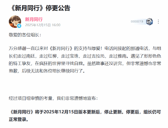 《新月同行》团队在公告末尾向全体玩家表达了谢意:“能和各位组长一路同行,我们深感荣幸,这段旅程中的温暖与遗憾,都将被我们铭记于心。”