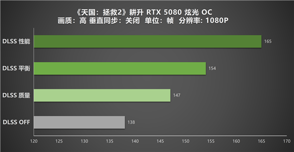 首先是在1080P分辨率下,耕升GeForce RTX 5080 炫光 OC可以轻松满足游戏在该分辨率最高画质下的性能需求,有着平均138帧的原生帧数。开启DLSS 超分辨率技术后,帧率进一步提升,质量模式的147帧与平衡模式的154帧都远超原生帧率,且完全不会出现任何大幅波动,性能冗余充足;而性能模式的帧率则直接拉满至了165帧,带来了绝佳的画面流畅度。