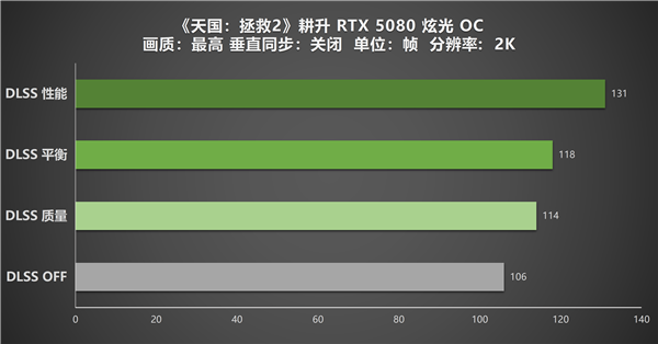 2在2K分辨率下,耕升GeForce RTX 5080 炫光 OC的性能优势能够得到更充分的展现。原生画面未开启DLSS时,帧率稳定在106帧左右,这一表现直观印证了显卡扎实的基础性能。开启DLSS后,帧率实现进一步提升,三种模式下均能保持100帧以上的稳定输出:平衡模式与质量模式分别达到118帧和114帧,在呈现写实细腻的中世纪场景时,能让战斗中的格挡、走位等操作更显丝滑流畅;性能模式的帧率更是高达131帧,即便面对大规模群战、烟雾火焰特效密集的画面,或是植被茂密的森林等高负载场景,也不会出现卡顿或掉帧的情况。