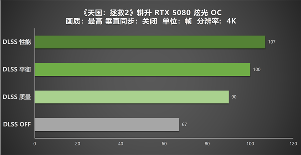 4K分辨率则释放出了耕升GeForce RTX 5080 炫光 OC的全部实力,即便在关闭DLSS的状态下,帧率也能稳在67帧左右,超过了流畅游玩的基准线。在开启DLSS后,游玩体验直接跃升——质量模式的90帧与平衡模式的100帧,既能把游戏场景中的表面纹理、光影反射、植被层次等细节完全展现,又足够支撑玩家的沉浸游玩体验。调整为性能模式后,游戏的平均帧率进一步提升至了107帧,哪怕是在森林潜行、沼泽湿地这类植被密集的场景,或是城堡攻防战里特效扎堆的画面,也能保持相当高的流畅度。