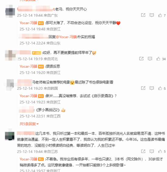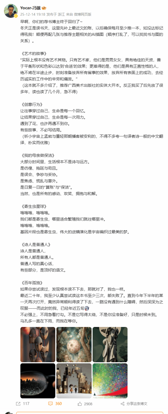 14号那天,游戏科学创始人兼《黑神话:悟空》制作人冯骥时隔许久在微博更新动态,一次性给网友推荐了6本书,算是把之前“欠下的推荐”补上了。他还承诺道:“往后每个月至少推荐一本,要是没做到大家记得提醒我!”
