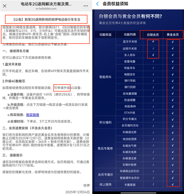 在哈啰App内,哈啰对此次变故的原因作了简单解释:“因国家2G网络全面退网,部分使用EB11、EB20智能芯的车辆可能出现无法开关锁的情况”。而公司给出的继续用车方案则是:用户可通过蓝牙启动开关锁,或自费购买“4G智能芯”,对于被影响的用户只承诺退还不含永久会员的部分会员费。