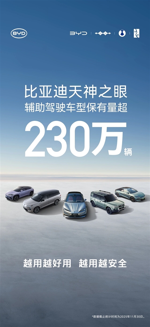 天神之眼及配套辅助驾驶车型累计销量已突破230万辆,其中仅11月单月销量就达311267辆,产品覆盖王朝、海洋、方程豹、腾势、仰望五大品牌矩阵。