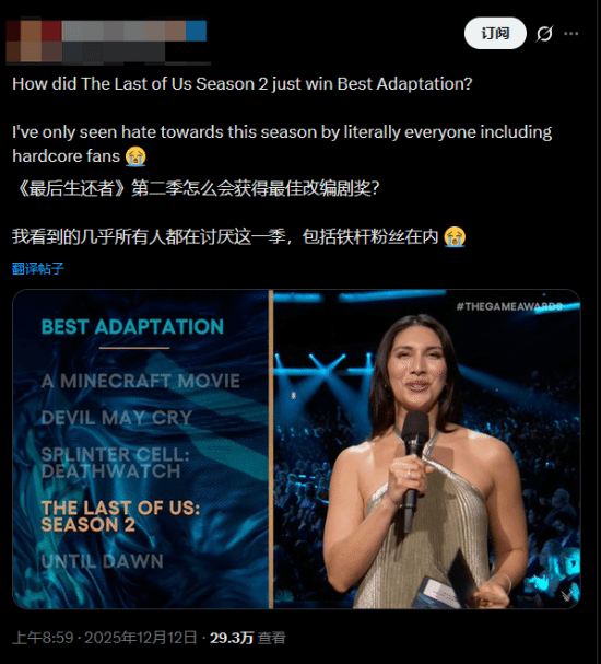 在今日的TGA颁奖典礼上,《最后生还者》第二季荣获最佳游戏改编作品奖项,其竞争对手包括《我的世界大电影》《鬼泣》《细胞分裂:死亡守望》以及《直到黎明》。