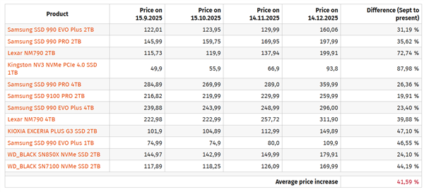 德国ComputerBase的统计数据表明,从9月中旬至12月中旬期间,内存价格平均涨幅达251.95%,最高涨幅超过300%;与此同时,SSD价格平均上涨41.59%,HDD价格平均上涨33.72%。