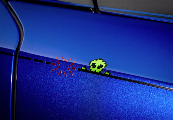 车身侧面的手绘腰线上,有由89个3毫米见方的像素块组成的“俏皮外星人”图案,旁边还点缀着小巧的8位像素爆炸图案,以此致敬早期街机游戏里的经典外星角色。