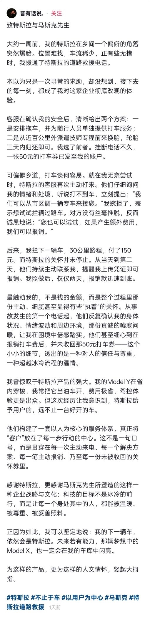 12月16日消息,近日,一位特斯拉车主驾车行至一条偏僻乡道时车辆抛锚,当时四周无人也无村庄,他随即拨打了特斯拉的救援电话,后续发生的一系列事情让他专门写下长文,向马斯克表达感谢。