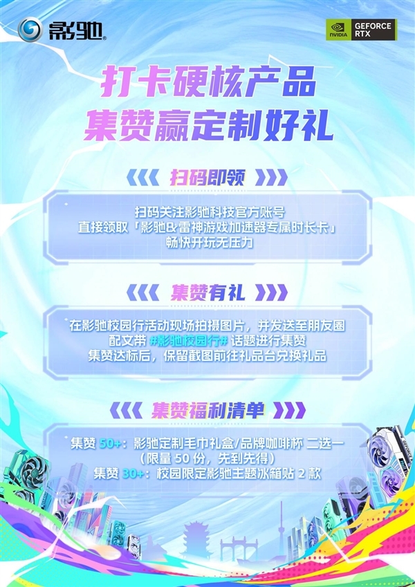 这次校园行活动,我们打算用超有创意的快闪形式,为硬件爱好者们打造一个专属的科技潮玩新据点!活动现场不仅会展出多款影驰RTX 50系列显卡,还有高性能主机体验区等你来探索!除此之外,只要在现场打卡并分享到社交平台,就能免费获得影驰的精美周边!简单一步,就能把逛展的快乐带回家。