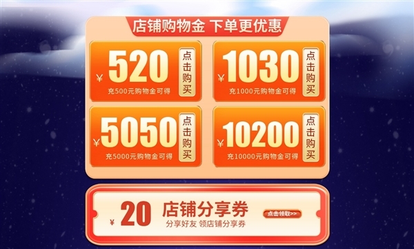 活动期间,充值店铺购物金可获额外立减金,充500元额外得20元,充10000元额外得200元,多充多送!此外,还能领取20元店铺分享券,享受折上折优惠!