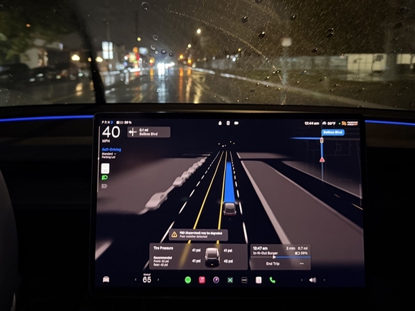 其中资深特斯拉车主兼FSD测试员“BLKMDL3”分享了试驾体验,当天他在洛杉矶的雨天环境中实测。