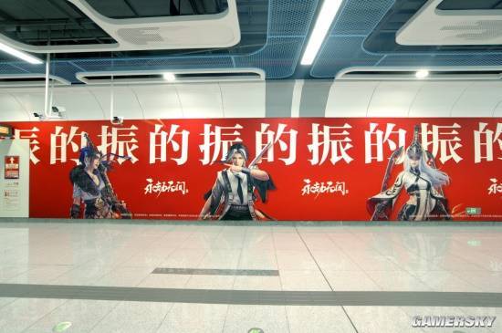 距离赛场最近的地铁出口处,贴满了《永劫无间》与本次赛事的宣传画面。在白色瓷砖的映衬下,一条长达数十米的红色巨幅海报格外醒目,吸引不少路人驻足观望;而临近扶梯出口处,与本次冠军总决赛“为‘振’而战”的宣传标语,又再次铺满整个地铁通道。