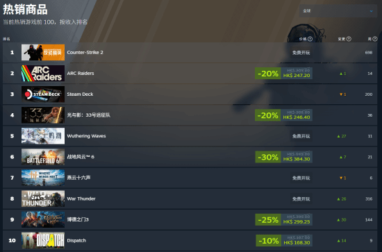 截至本文撰写时,《鸣潮》在Steam全球热销榜上位列第五,不仅超过了国产开放世界力作《燕云十六声》,还仅次于TGA年度游戏《光与影:33号远征队》,而且其排名目前仍在持续攀升!